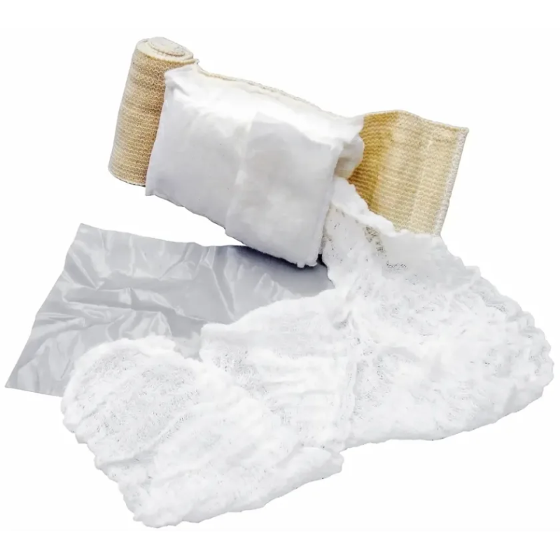 Le bandage comprend 3 mètres de gaze stérile en 4 couches, conçue pour offrir une flexibilité de traitement — allant de la couverture de blessures mineures au bourrage de plaies graves. Une feuille plastique occlusive amovible intégrée au coussinet de pansement permet de créer un joint hermétique autour des plaies, renforçant ainsi la polyvalence et l'efficacité du bandage pour empêcher l'infiltration d’air et de liquides.