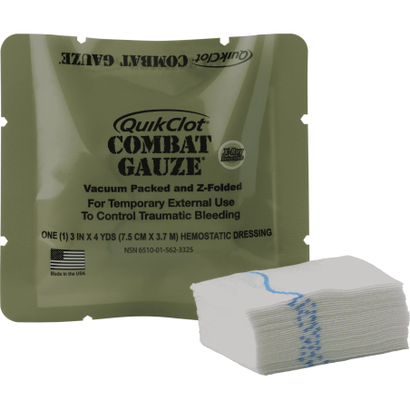 QuikClot® Combat Gauze™ est pansement hémostatique de référence, conçu pour un contrôle rapide et efficace des hémorragies sévères. Imprégnée de kaolin, un minéral inerte, cette gaze stérile non tissée mesure 7,6 cm sur 3,6 mètres et est pliée en Z pour faciliter son application.
