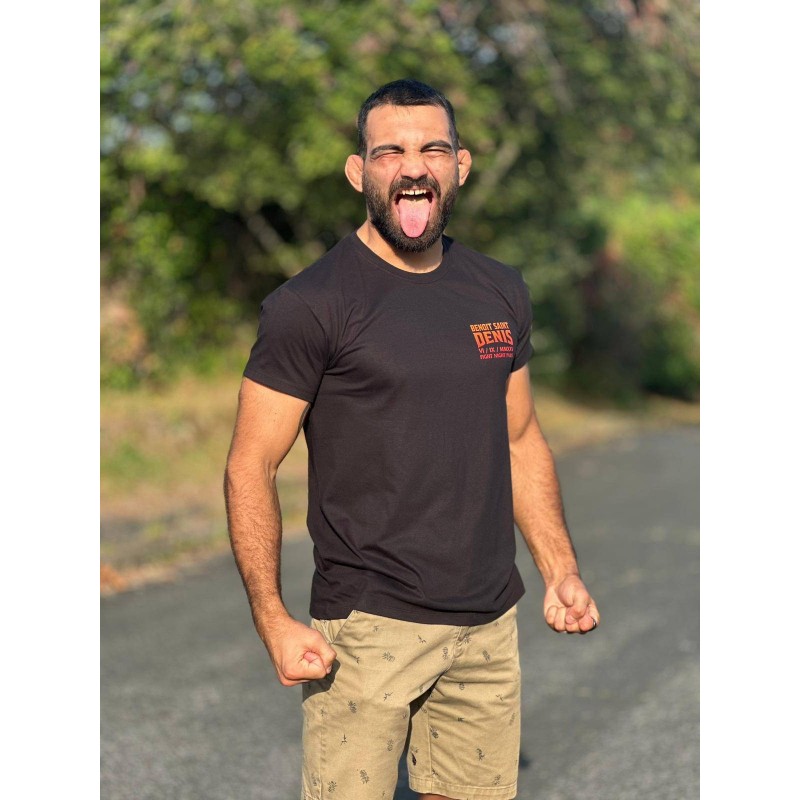 À l’avant, un marquage aux teintes ardentes rappelle la date et le lieu du combat. Dans le dos, une illustration saisissante met en scène BSD, le regard de feu, prêt à embraser l’Octogone. Ce visuel incarne toute la puissance, la rage et la détermination du God of War.